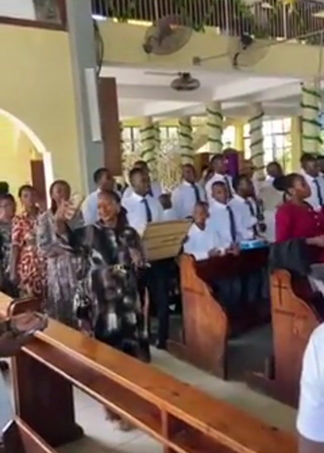 A group of people, including women, young boys, and men, are singing in what appears to be a church. The choir of young boys, wearing white shirts and ties, are standing in the pews, singing from a music stand. A woman in a patterned dress is standing and recording the choir with her phone, dancing and smiling. Other women are standing nearby, also smiling and enjoying the music. The church is decorated with green and white garlands, and there are ceiling fans. The pews are wooden with crosses on the ends.