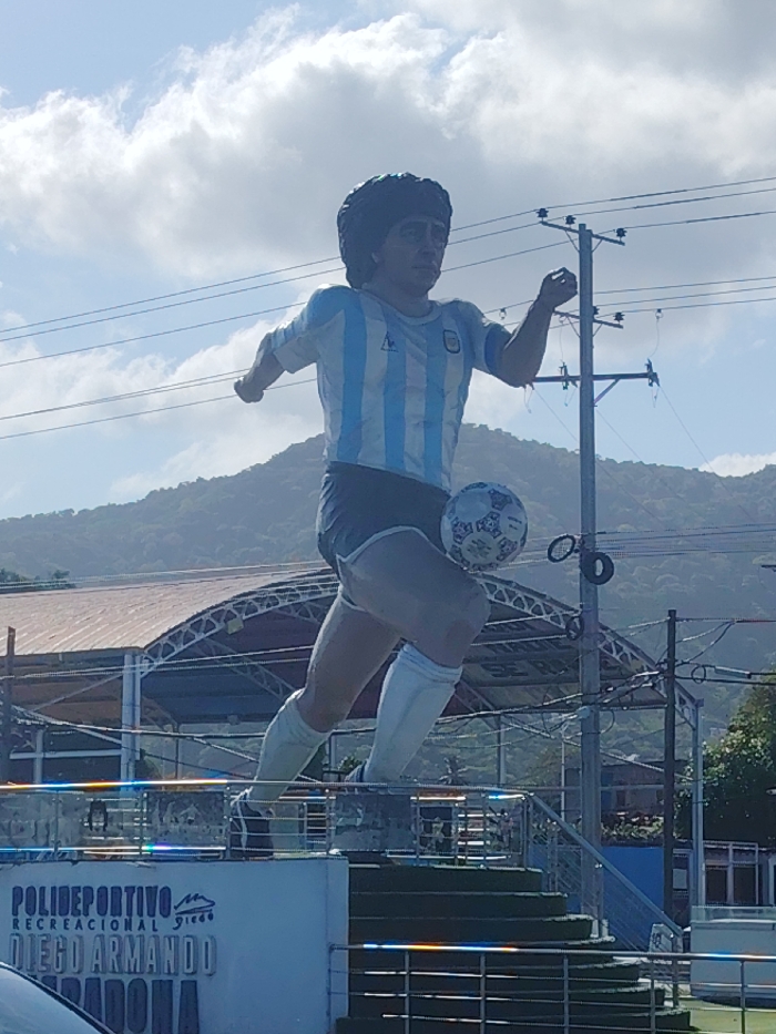 The image displays an oversized statue of Argentinian footballer Diego Maradona in a dynamic pose, dribbling a white soccer ball