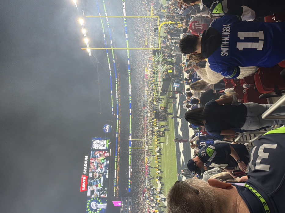 A packed stadium at night with Levi's Stadium visible. Spectators watch the event, some wearing Seattle Seahawks jerseys. One jersey displays "SMITH-NJIGBA" and the number "11." Another jersey shows the number "31." LED displays line the stadium, adding to the bright atmosphere. People are sitting in the stands.