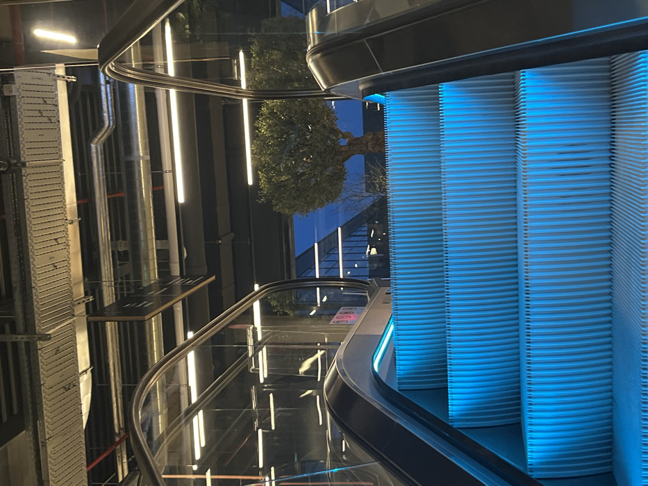 An escalator with blue lighting dominates the right side
