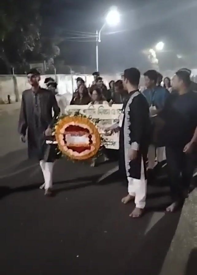 A group of people are walking down a street at night. Two men in the front are carrying a large wreath decorated with orange and white flowers, with a small image in the center. Behind them, other people are holding a banner with text on it. The people are dressed in a variety of clothing, including traditional garments. Streetlights illuminate the scene, and some light mist is visible in the background. The men carrying the wreath are walking barefoot.