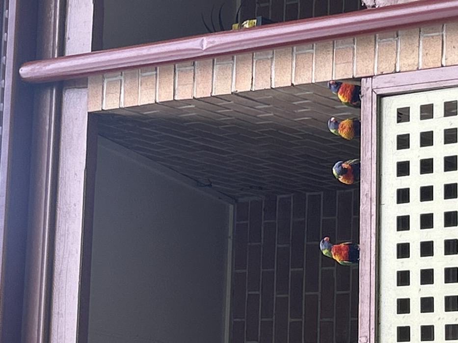 - "Four rainbow lorikeets peek out from a window opening" by FM-Ewbxn2, licensed under CC BY 4.0