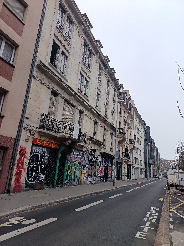 This image depicts a street scene in Strasbourg, France, characterized by multi-story urban architecture under an overcast sky. The primary focus is the left side of the street, lined by a series of contiguous buildings. On the immediate left, a multi-story building with a light-colored facade, likely stone or stucco, dominates the frame. It features numerous rectangular windows with dark frames, several of which are open, and multiple small balconies with black wrought-iron railings. Decorative cornices and window surrounds are visible. The ground floor of this building displays heavy, multi-colored graffiti, predominantly covering the lower half of two commercial storefronts. One storefront, marked with a red "RESTAURANT" sign, has a closed green metal roller shutter covered in white and black spray paint. Adjacent to it, another storefront, also heavily graffitied, displays a "Yu Club" sign. A closed, light-colored roller shutter is visible on the first floor above the ground-level graffiti. The asphalt road, a two-lane thoroughfare, runs from the foreground into the distance. It is marked with white lines, including a bicycle lane symbol on the left, a dashed center line, and solid lines on the right delineating a parking area. The word "ECOLE" is stenciled in white on the road surface near the right curb. No pedestrians or moving vehicles are present. Further down the street, additional buildings of varying architectural styles, including modern structures with glass facades, line both sides. On the far right, a white utility van with red and black text is parked. Bare tree branches are visible against the diffused light of the uniformly gray, overcast sky.