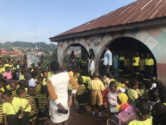 The image captures an outdoor assembly of approximately 70-80 individuals, predominantly young children, in Aramoko-Ekiti, Nigeria