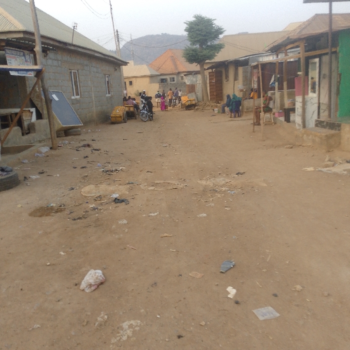 A dirt road runs through a village scene. Simple brick or block buildings line the sides, some with stalls or awnings. People are gathered near a building to the right, some seated. A motorcycle and a small group of people walk in the center of the road, near boxes. Litter is scattered on the ground. A distant hill is visible in the background. The sky is overcast.