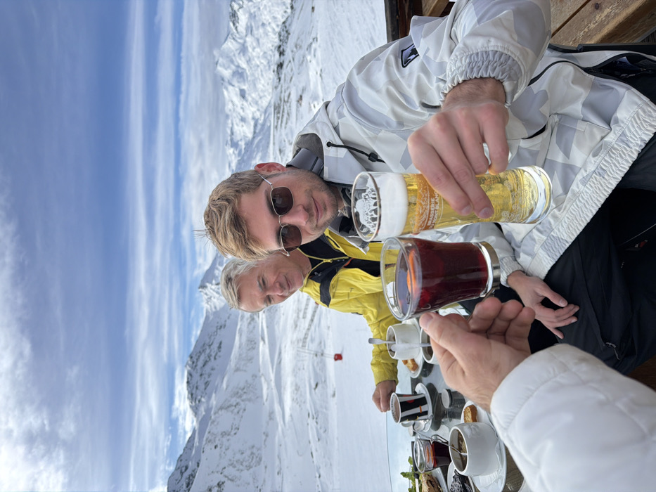 An outdoor scene in Saint-Martin-de-Belleville, France, depicts three individuals at an outdoor table on a snow-covered mountain with a vast, snowy mountain range under a partly cloudy blue sky in the background. In the immediate foreground, a person's left arm, clad in a white jacket, extends into the frame, holding a glass of dark red liquid containing orange slices, appearing to make a toast. To the right, a young adult male with blonde hair, wearing rectangular sunglasses with dark lenses and a grey and white camouflage-patterned ski jacket, holds a tall glass of light-colored beer, branded "BRASSERIE DU MONT BLANC," clinking it with the red drink. He is looking directly at the viewer with a slight smile. Seated to his left and slightly behind, an older adult male with short grey hair and a bright yellow ski jacket is visible, looking towards the left with a subtle smile. The clear glass tabletop features multiple white mugs, some with dark patterns, containing dark liquids and spoons, along with small plates holding pastries or snacks. A red ski lift chair and pole are visible in the mid-distance on the snow-covered slope to the left. The table is situated on a wooden deck or patio area.