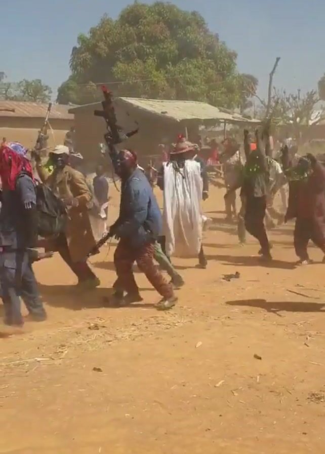 A crowd of people is moving across a dirt ground, kicking up dust. Some people are holding long sticks. One person is wearing a white robe and tall hat. The setting appears to be a village with small buildings in the background and a tree on the left. The sky is blue.