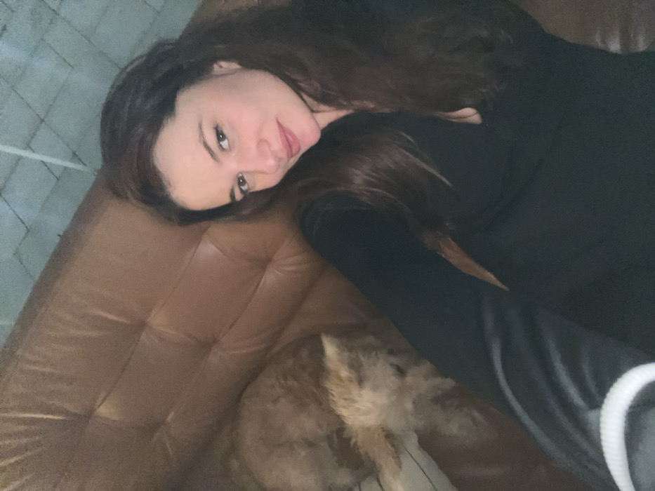 A woman with long dark hair lies on a tufted brown leather couch, looking at the camera. She wears a long-sleeved black top. A small, furry dog curls up near her on the couch, blending into the background. The picture is taken at an angle, with a hint of an off-white surface in the background. The lighting is somewhat muted.