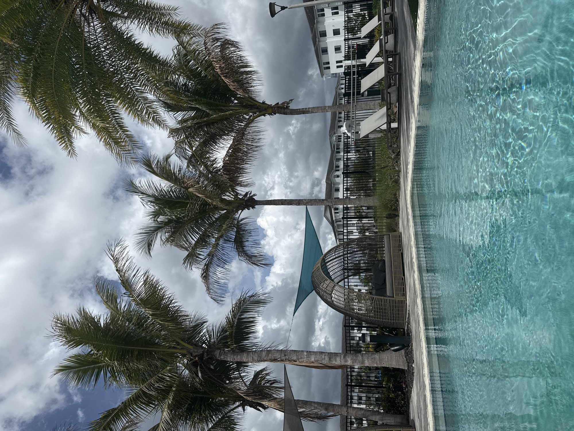 The image captures a scene next to a swimming pool, lined with lounge chairs, palm trees, and a wicker chair