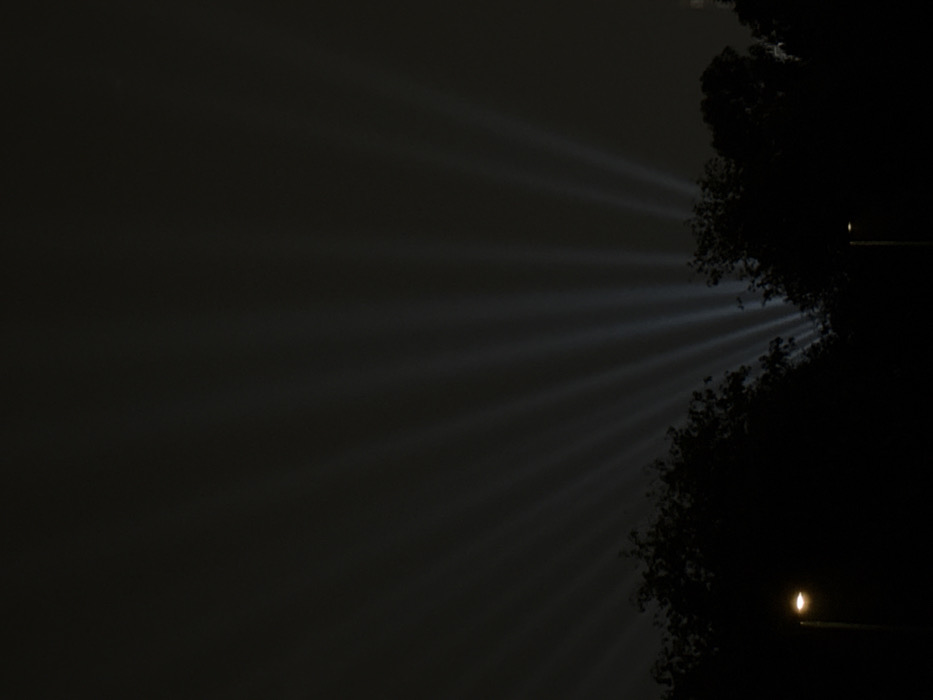 The image captures a nighttime urban scene in Tel Aviv, Israel, likely at Rabin Square. Approximately twelve to fifteen distinct, narrow, whitish-blue light beams project upwards from below the visible horizon, fanning out into a dark, hazy sky that occupies the upper two-thirds of the frame. The lower third is filled with the dark silhouette of dense tree foliage, which obscures the ground and the origin point of the light beams. A single streetlight pole on the left emits a warm orange-yellow glow, and a second pole with a similar glow is partially visible on the right. No individuals or specific activities are present within the frame.