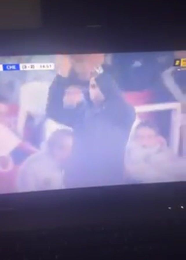 A laptop screen shows a soccer game between Chelsea and Arsenal. The score is Chelsea 3, Arsenal 2, and the time is 74:55. The camera then focuses on a man in a dark jacket standing on the sideline. The background is filled with other people in various clothing. The laptop's keyboard is visible in the foreground.