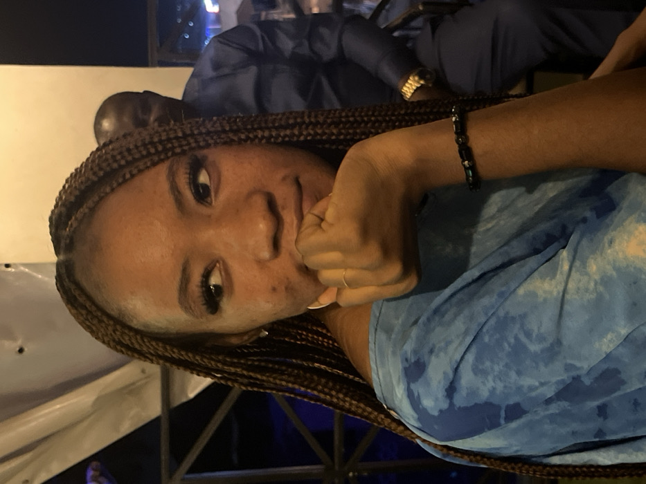 A dark-skinned woman with braided hair is resting her chin on her fist, gazing directly at the viewer. She wears a blue tie-dye shirt and a bracelet made of dark beads. Behind her, a man in a blue shirt is visible, wearing a gold watch. The photo seems to have been taken in an outdoor setting, possibly at night, with a hint of city lights in the background.