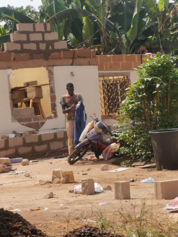 An outdoor scene in Ani-Ugbo, Nigeria, shows a dark-complexioned adult male standing on reddish-brown, dusty ground. He wears a light-colored graphic t-shirt and light-colored long pants, and is holding a blue piece of fabric or clothing, seemingly manipulating it with both hands. To his right, a light blue/purple motorcycle is parked, loaded with a white bag and a striped bag. Behind the man is a building wall in a state of construction or deconstruction, featuring exposed reddish-brown bricks, newly laid lighter-colored concrete blocks, and a section broken open to reveal an interior yellow-painted wall with wooden framing and stacked bricks. A window opening with an ornate iron grille is visible further right on the building. Lush green banana plant leaves are prominent in the background above the building. To the far right of the motorcycle, a dense green shrub and a dark-colored plastic barrel are visible. The ground is scattered with debris including brick fragments, concrete blocks, small stones, and plastic items. In the bottom-left foreground, a pile of dark, rounded objects is visible on the ground.