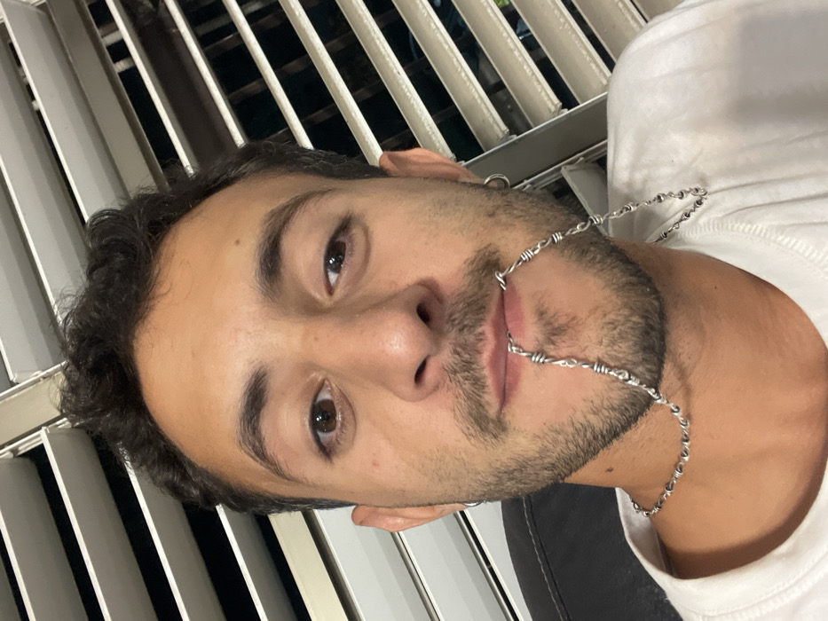 The image depicts a close-up portrait of a single male individual indoors in an unknown city and state. The man, appearing to be a young adult, has olive skin, dark brown eyes, and dark, wavy hair. He sports sparse facial hair on his chin, jawline, and upper lip. He wears a white crew-neck t-shirt and a silver hoop earring in each earlobe. A silver-colored chain, designed to resemble barbed wire, is held between his closed lips and extends down, visible as a necklace around his neck. The man is looking directly at the camera with a neutral expression. The background features light-colored, horizontal louvered blinds, with a darker area visible through the slats, suggesting an interior space or night outside. A dark, possibly upholstered object, is partially visible behind the subject's left shoulder.