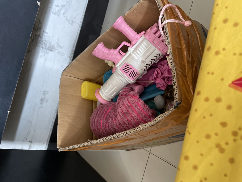 A cardboard box is filled with various items. A pink and white toy gun sits atop the contents, which include a yellow rectangular object, pink fabrics and a pink textured plush item. A drawstring bag is secured to the top of the box. The box is positioned on a tile floor next to a black and white surface. A yellow object with brown spots is also visible on the right.