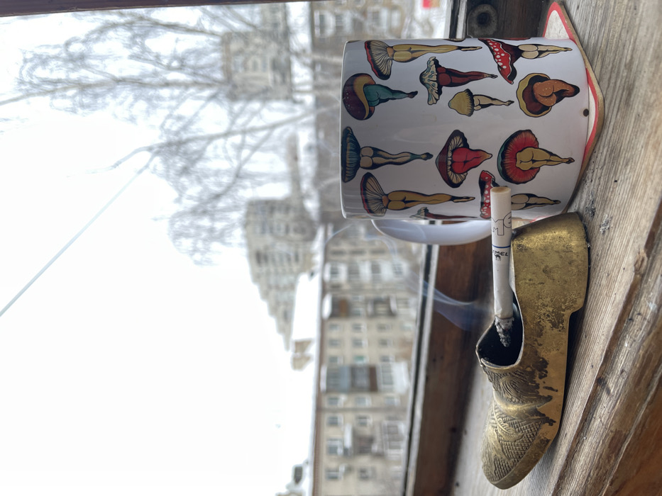 The image depicts a still life arranged on a wooden windowsill overlooking a snow-covered urban environment in Yekaterinburg, Russia. In the immediate foreground, a weathered, dark wooden windowsill serves as the base. On the left, a decorative brass ashtray, shaped like a slipper or shoe with an embossed pattern, contains a lit cigarette. A slender plume of smoke rises from the cigarette, and some ash is visible within the ashtray. To the right of the ashtray, a white ceramic mug with a handle rests on a small, round coaster with a red border. The mug is adorned with whimsical illustrations of various mushrooms, each depicted with human-like legs and buttocks. A faint wisp of steam is visible above the mug, indicating a hot beverage. Beyond the windowsill, the outdoor scene is a snowy, overcast winter day. The ground and rooftops of the visible buildings are blanketed in white snow. Several multi-story residential buildings, consistent with common architectural styles found in Russian cities like Yekaterinburg, are visible in the middle distance. These structures appear to be made of light-colored masonry, with numerous windows and some balconies. Bare, deciduous trees with intricate branch patterns are scattered throughout the scene, also appearing to be dusted with snow or frost. The sky is a uniform, bright white-grey, characteristic of heavy cloud cover or snowfall. A thin, light-colored diagonal line, possibly a power line or cable, stretches across the upper left quadrant of the exterior view.