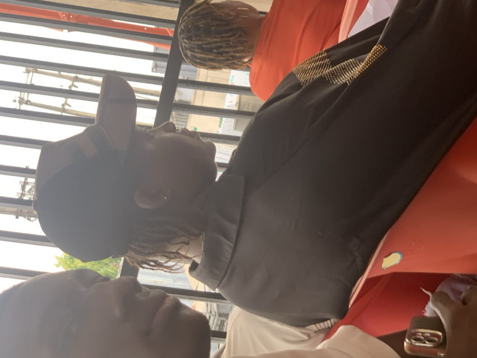The image captures three individuals seated in an indoor or semi-sheltered location within Onitsha, Nigeria, looking towards an urban exterior