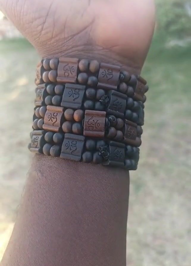 A close-up shot shows a dark-skinned wrist wearing multiple wooden bead bracelets