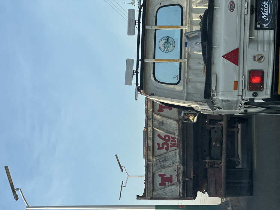 The image depicts a daytime street scene in Jos, Nigeria, featuring two vehicles traveling in the same direction under a clear blue sky. In the foreground, viewed from the rear-right, is a white, compact utility truck. Its tinted light-blue rear window displays a circular sticker of a person with round glasses and a bald head, and a small red heart sticker. Two rectangular lights are mounted on the truck's roof rack. In the truck bed, a grey plastic jerry can is visible. The rear of the truck features a red triangular warning reflector with "CAUTION" text, an illuminated red taillight on the driver's side, a Real Madrid club sticker, and a "Mack" logo sticker near the license plate area. The driver's reflection, showing a person with dark skin wearing a yellow garment, is visible in the left-side mirror. Preceding the white truck is a large, weathered, red-brown dump truck (tipper truck), seen from the rear. Its tailgate is heavily soiled and shows red graffiti-style "T" letters on either side and the text "56 KM" in red in the center. The truck bed appears empty. The environment includes a tall, silver street light pole with a single LED fixture on the far left, and another, shorter street light pole with two LED fixtures on a Y-shaped arm further back. Dark overhead lines (likely power or communication cables) are visible on the right. A dark asphalt road surface is present, and a green vertical structure is partially visible on the far left beyond the dump truck.