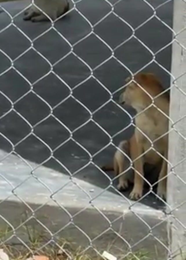 two light-brown dogs in a chain-link fence enclosure. One dog is lying down and the other is sitting. The sitting dog howls once, then looks directly at the camera. The enclosure is concrete with grass growing outside the fence. There is a concrete post on the right side of the frame. The shot is taken at ground level.