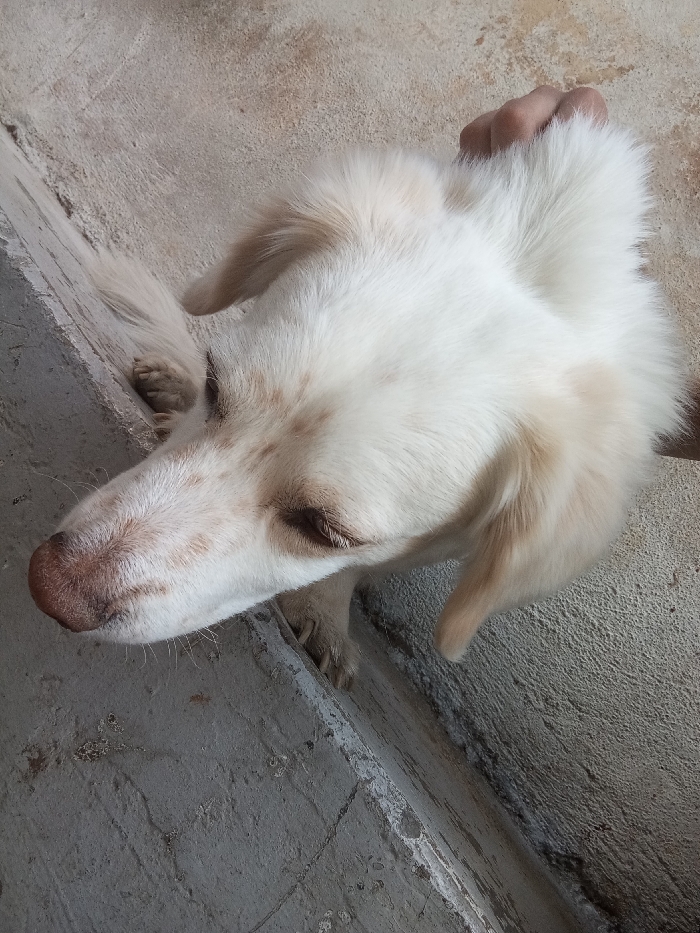 A white-furred dog with patches of light tan fur around its eyes and muzzle is depicted in an overhead view, situated within Ash-Shaghour Municipality, Syria. The dog's reddish-brown nose points towards the lower-left, and its eyes are cast downwards. A human hand, exhibiting light skin pigmentation, is positioned on the dog's upper back or neck region, indicating physical interaction. The dog's left foreleg and part of its tail are visible on the left side of the frame. The entire scene rests on a light grey concrete surface, characterized by textured irregularities, seams, and areas of discoloration, suggesting wear.