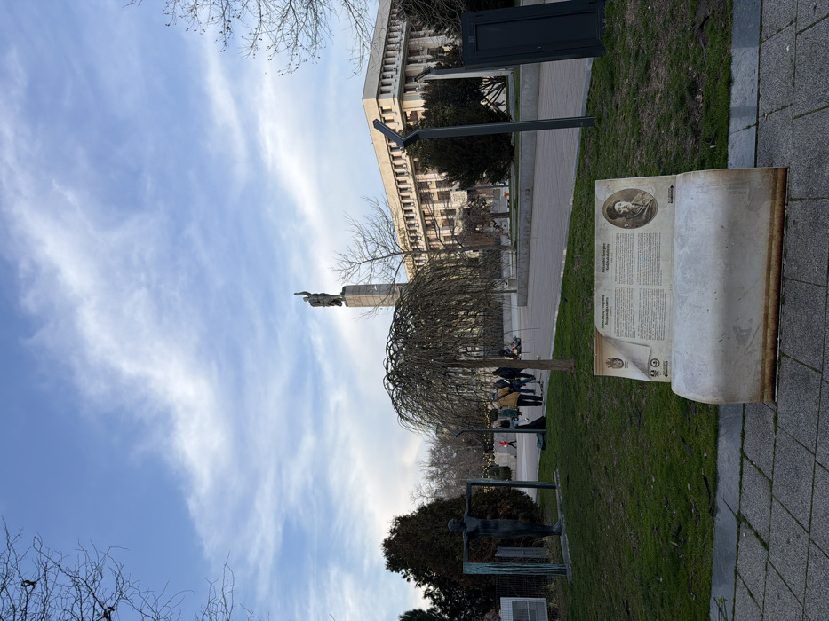 The image depicts a public square in Burgas, Bulgaria, specifically Troika Square, featuring the Monument to the Soviet Army (Alyosha monument) and the Burgas Municipality building. In the foreground, a weathered, white information panel shaped like an open book rests on a patch of green grass bordering a paved pathway. The panel displays Cyrillic text and a historical portrait. To the left, a bronze-colored abstract human figure sculpture with outstretched arms stands between two vertical metal posts. A bare, weeping tree with drooping branches is centrally positioned on the grass. The midground features a wide, paved plaza where approximately seven individuals, dressed in coats, walk from left to right. Bare deciduous trees and some evergreen shrubs are scattered throughout. On the far right, a tall, dark gray pole-like structure leans slightly. In the background, the Monument to the Soviet Army rises prominently, consisting of a tall, light-colored rectangular pedestal topped with a bronze statue of a male figure with his right arm raised and pointing. To the monument's right, the large, multi-story Burgas Municipality building is visible, characterized by a light-colored facade with numerous windows and columns. The sky above is a light blue with scattered white, wispy clouds. The overall scene is illuminated by natural daylight, suggesting late autumn, winter, or early spring due to the bare tree branches.