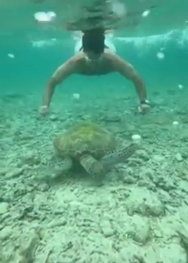 man swimming underwater, with a sea turtle resting on the ocean floor below him. The man is wearing a diving mask and appears to be observing the turtle. The ocean floor is light-colored, possibly composed of sand and coral. The water is clear and turquoise. The man is swimming horizontally with his arms extended. The turtle is stationary, facing towards the camera.