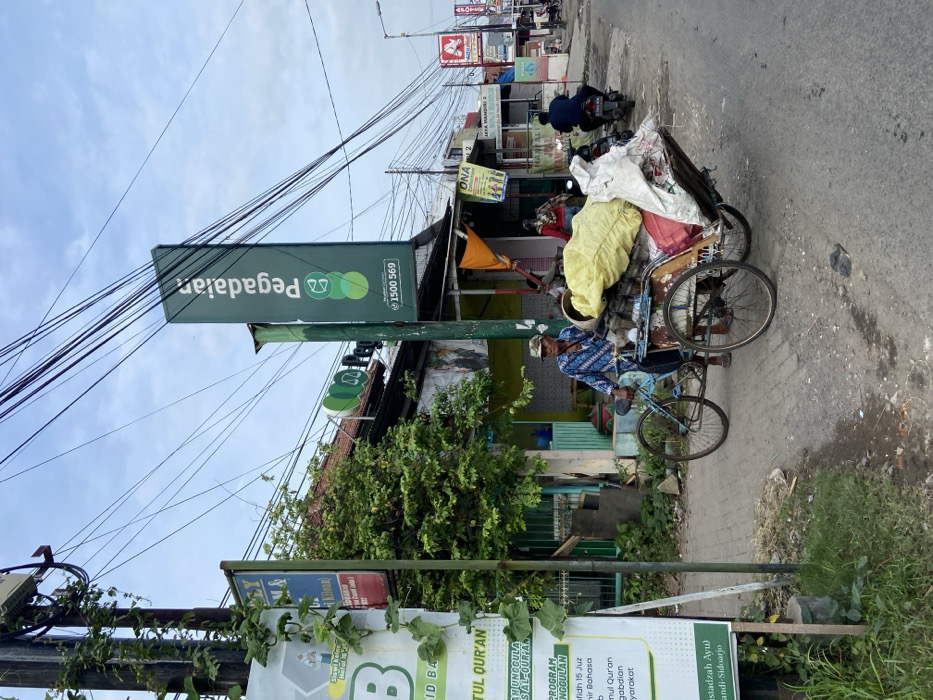 An outdoor scene features a man on a tricycle loaded with goods, positioned next to a "Pegadaian" pawn shop sign