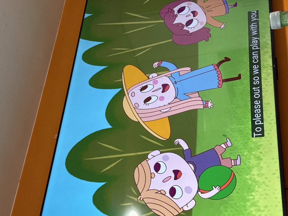 - "An image captured in Sofia, Bulgaria, displays a television or monitor angled upwards, presenting an animated scene featuring three stylized cartoon children outdoors" by FM-Tldlu2, licensed under CC BY 4.0