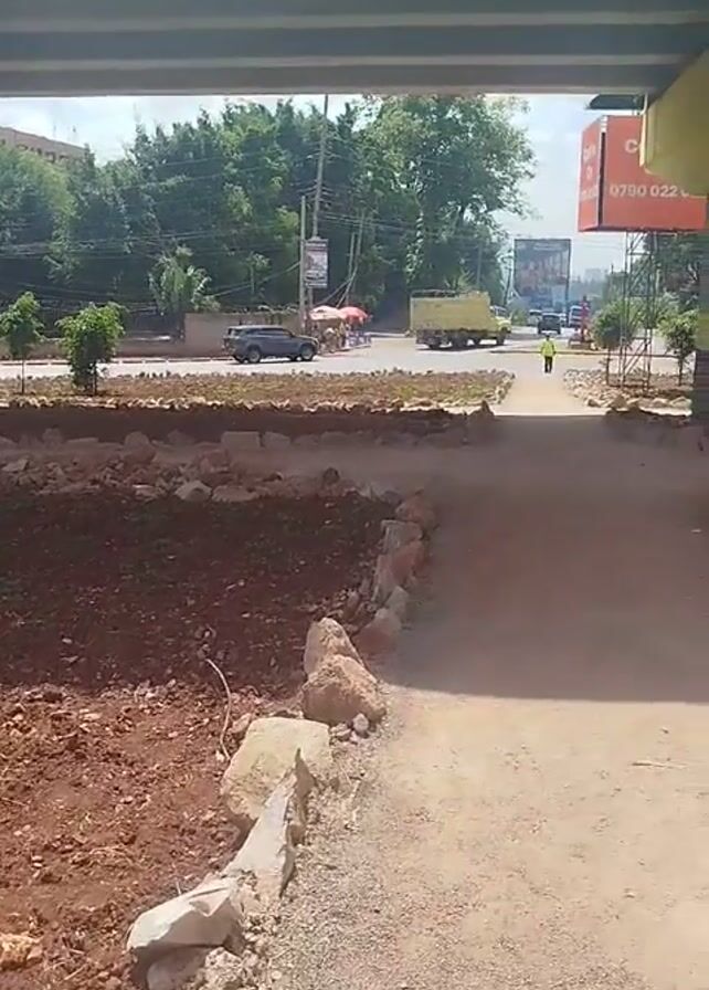 n outdoor scene under a bridge. The bridge structure is visible overhead, with traffic moving on the road beyond. Below, a dirt pathway runs from the foreground towards the road, flanked by small rock borders and patches of soil. Cars, a truck, and a pedestrian in a reflective vest can be seen in the background. A billboard is also visible, displaying a phone number. The overall setting appears to be an urban landscape.