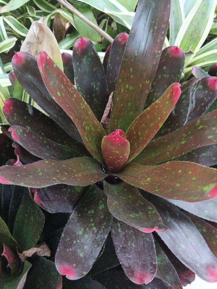 A bromeliad plant fills the frame, viewed from above. The leaves are mostly dark green with maroon hues and scattered green spots. Leaf tips are vividly red. They form a radial pattern around a central, budding, red structure. The background includes other green plants with striped leaves.