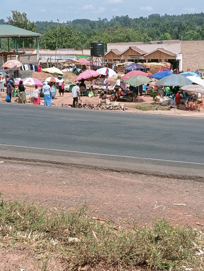 The image depicts an active roadside market situated in Ngenyilel ward, Kenya