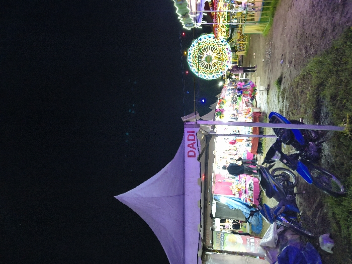 The image depicts an outdoor night market or fairground scene in An Khe Ward, Vietnam. The time is nighttime, characterized by a dark, clear sky above artificially lit structures. In the foreground, on the left, stands a white pyramidal tent with the word "DADI" inscribed in red capital letters on its front canopy. Directly in front of this tent, two blue motorcycles are parked on a ground composed of dark soil with patches of green grass and some visible debris. Within the "DADI" tent, merchandise, appearing to include toys and other retail items, is displayed on tables. Two individuals are discernible inside this tent. A dirt path extends from the foreground into the background, flanked by numerous other vendor stalls and tents, all emitting light. In the mid-ground, towards the right, a large, brightly illuminated, circular structure, resembling either a Ferris wheel or a decorative light display, is prominent with multi-colored lights. To its immediate right, a partial view of another illuminated carnival ride, potentially a carousel, is visible behind a green fence. Several other human figures are present in the mid-ground and background, appearing to walk along the path or stand near the stalls. The overall environment is bustling with activity and illuminated by various artificial light sources emanating from the market stalls and attractions.