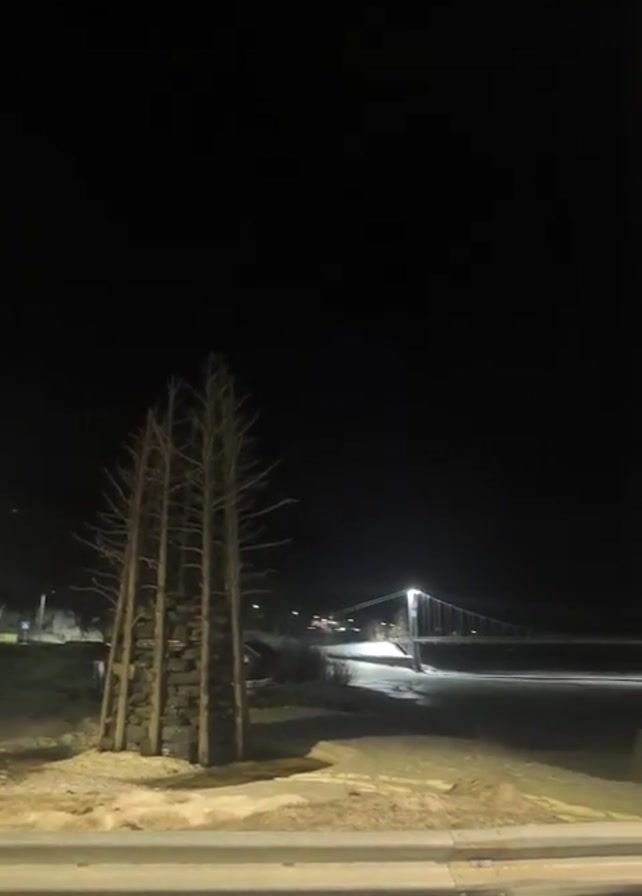 At night, a low-angle shot captures an illuminated bridge spanning a body of water. In the foreground, a sculptural arrangement of logs stands on a sandy or grassy area beside a road. Streetlights are visible along the road. The overall setting is dark, with the bridge lights providing the primary source of illumination.