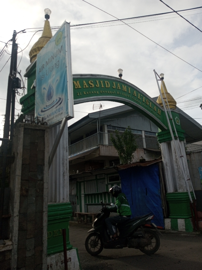 A mosque entrance, marked "MASJID JAMI AL-ISLAH," features a green archway topped with golden domes