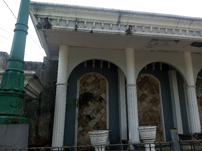 A weathered building exterior features a row of arches supported by fluted columns. The archways reveal stone patterned walls. A decorative cornice lines the roofline, showing signs of age and discoloration. A tall green lamppost stands to the left of the structure. White ornamental planters sit in front, adding a touch of faded grandeur. A partial view of a fence is also seen at the front of the building.