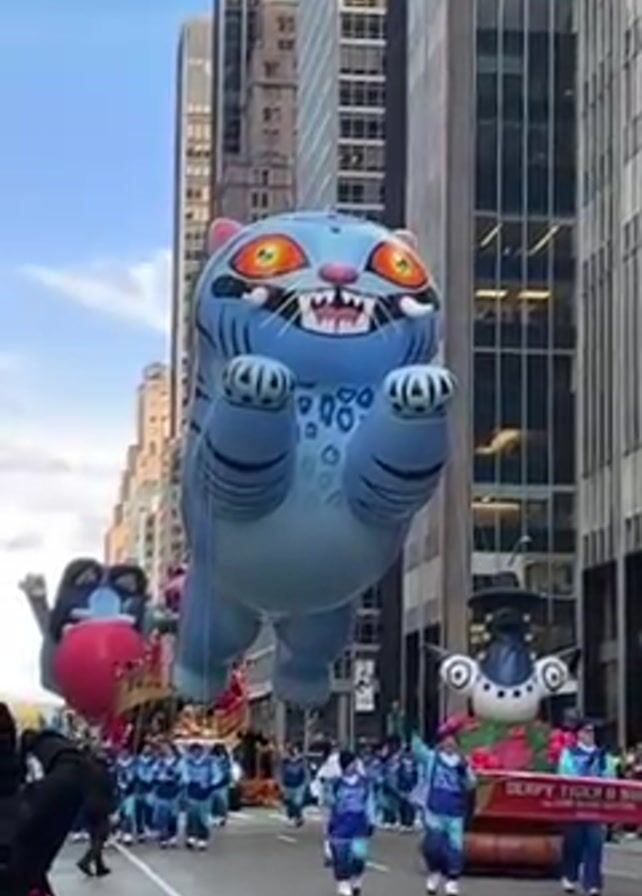 large, blue, tiger-shaped balloon floating in a parade through a city street
