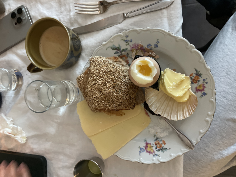 A breakfast spread is presented on a white tablecloth, likely in Copenhagen, Denmark. The primary subject is a floral-patterned porcelain plate holding several food items: two slices of light yellow cheese, a sesame-crusted bread roll (likely a rundstykke), a soft-boiled egg in a dark egg cup with its top removed and a visible runny yolk, and a portion of yellow butter served in a white scallop shell-shaped dish. A small pile of white granular salt is also on the plate, near the cheese. To the right of the plate, a silver knife and fork are arranged. Above the cutlery, a dark green and blue patterned mug containing a light brown beverage, possibly coffee with milk, is positioned. Two clear glasses filled with water are visible, one directly above the plate and another partially visible further back. In the upper right quadrant, a silver-colored smartphone with a multi-lens camera array rests on the tablecloth. A blurred hand is partially visible in the upper left corner, indicating recent human presence or interaction. A small, stainless steel cup containing a light green item is in the lower left background. The overall scene depicts a prepared meal, suggesting an ongoing or imminent breakfast.