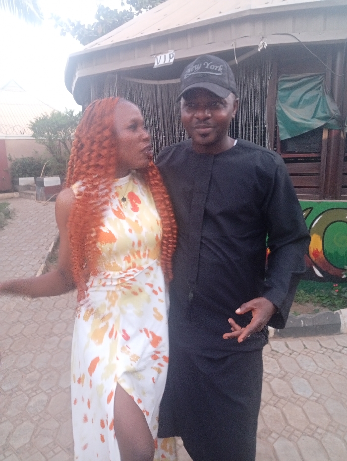Two people stand closely together in front of a building with a "VIP" sign. The woman, on the left, wears a long white dress with orange and yellow spots, a side slit, and has orange curly hair. The man, on the right, wears a black shirt, black hat with "New York" on it, and dark pants. The building behind them features decorative curtains, and there's greenery and some pavement visible.