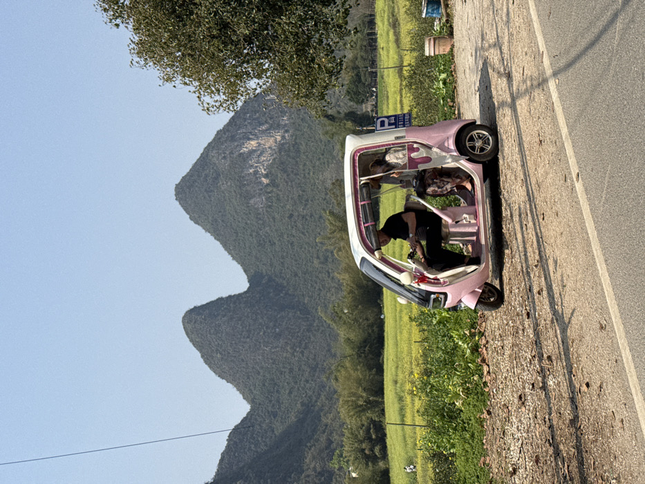 This image depicts a pink and white electric three-wheeled vehicle, resembling an auto-rickshaw, parked on a gravelly dirt shoulder adjacent to an asphalt road in the rural outskirts of Guilin, China. The vehicle, featuring an open-sided design with a windshield and roof, has decorative white bows affixed to its front. A male driver, dressed in a dark shirt and pants, is seated in the left-hand driving position, appearing to operate controls. A female passenger, wearing a light-colored top and patterned lower garment, occupies the rear seat, with her left hand visibly raised. The immediate environment includes the asphalt road and the bordering dirt shoulder. The mid-ground features an expansive field of vibrant yellow flowers, consistent with rapeseed, stretching towards a line of dense green trees and foliage. The background is dominated by several towering, tree-covered karst mountains, characteristic of the Guilin region, set against a clear, light blue sky. One mountain prominent in the background exhibits a distinct patch of lighter rock on its upper right face. A thin dark line, possibly a power cable, descends diagonally from the upper left corner of the frame. A blue sign with white text and a parking symbol is partially discernible behind the vehicle on the right, while a brown pot and a blue container are situated further right, partially obscured by a tree branch.