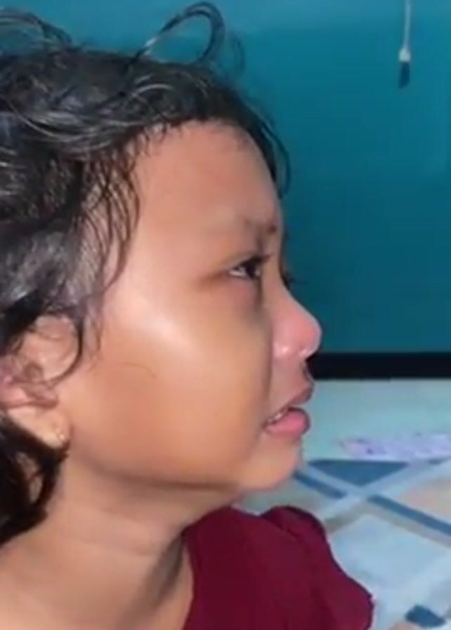 A young girl with wet, curly hair and braces is crying. She is wearing a maroon shirt and is looking to the side. Tears are streaming down her face. The background consists of a teal wall and a patterned floor. A small white object is visible in the bottom right corner of the frame.