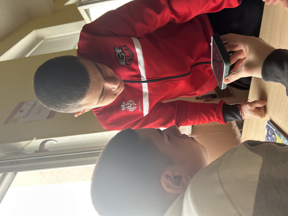 An indoor scene in Cherven Bryag, Bulgaria, depicts two young males and an unseen hand. A male with short dark hair, wearing a light-colored hooded sweatshirt, is seated on the left, viewed in profile, looking towards the right. A book with "A +" visible on its cover rests on the light wooden desk in front of him. A second male, also with short dark hair, stands on the right, leaning forward and looking down. He wears a red full-zip jacket with a white horizontal stripe across the chest, featuring logos including a stylized "K" with "Karlos Nasar" and a "СТАРТ" (START) barbell logo. His right hand, adorned with a red string bracelet, is clenched into a fist and rests on the desk. An unseen hand in the lower right holds a black smartphone horizontally, enclosed in a dark green or grey case, with its USB-C port visible. Both visible males are directing their gaze towards this smartphone. The background includes a window on the left, admitting strong natural light, and a light-colored wall displaying a partial poster with the text "Remind..." visible.