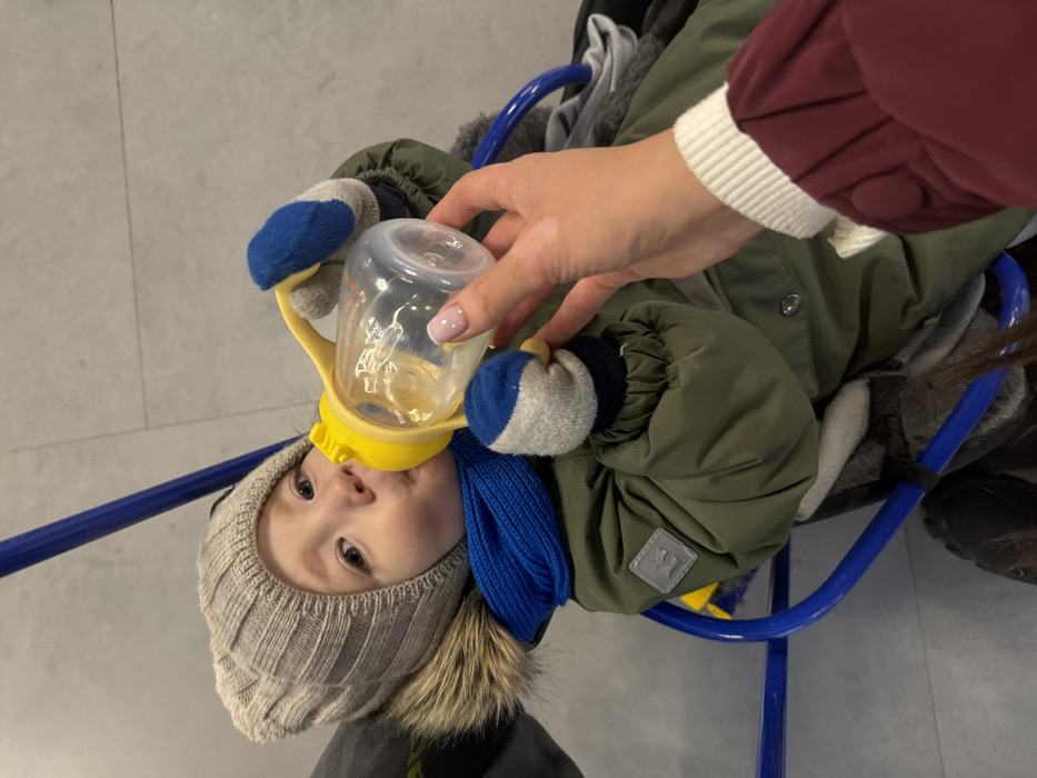 A young child, approximately a toddler, is depicted seated and drinking from a clear plastic baby bottle with a yellow cap and handles. The child wears a light grey ribbed knit beanie with a fur-trimmed edge, a bright blue knitted scarf, and an olive green winter coat featuring a reflective grey patch on the left sleeve. Their hands are covered by grey, white, and blue striped mittens. The bottle, containing a white liquid, is held at its base by an adult's hand, which has light pink manicured fingernails with white tips and a distinct lighter skin patch on the dorsal surface. The adult's attire includes a white ribbed cuff and a partial dark red (maroon) sleeve with buttons. The child appears to be situated in a blue-framed apparatus, possibly a stroller or shopping cart seat. The background shows a light grey floor, consistent with an indoor public environment such as a mall or large store, located in Unknown, Russia.