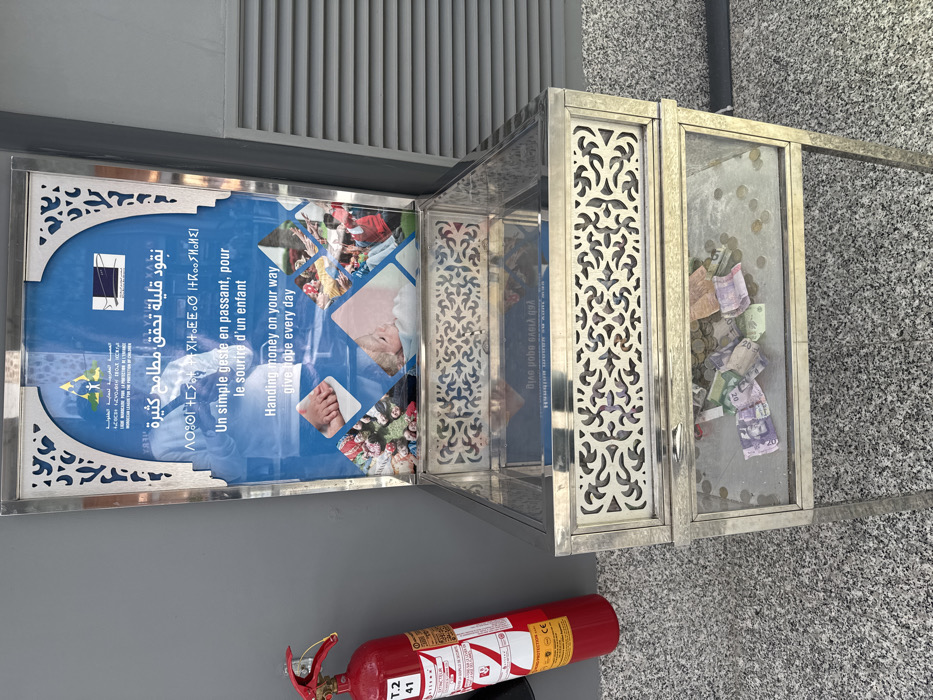 This image captures a static scene within Ouled Tayeb, Morocco, featuring a donation stand and a fire extinguisher