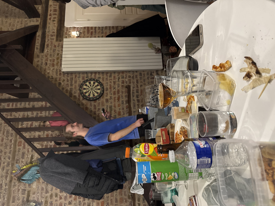 A messy white table is laden with empty food containers, bottles, glasses, and discarded food scraps. A phone lies atop. Adjacent, a man in a blue shirt stands near a wooden staircase, facing a dartboard hanging on a brick wall. A grey coat hangs on the stairs. The room's decor features exposed brick and a white radiator.