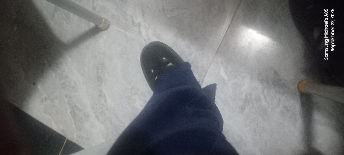 An indoor scene in Uweyoba, Nigeria, features a human foot resting on a light-colored, marble-patterned tiled floor. The foot, positioned in the mid-left quadrant, is clad in dark blue fabric, likely trousers or sweatpants, and a dark-colored, possibly black, slip-on shoe with multiple circular perforations across its upper surface. The floor exhibits a greyish hue with discernible veining and grout lines; minor surface debris is present. Shadows are prominent, suggesting an interior setting with directional lighting. A metallic cylindrical leg, consistent with furniture, is visible vertically in the upper right of the frame, casting a shadow. Another similar metallic leg with a light brown cap is partially visible at the bottom center. A bright, reflective area appears on the floor in the lower right quadrant. A digital timestamp overlay reads "Samsung Michael's A05 September 23, 2025." No other individuals or active interactions are depicted.