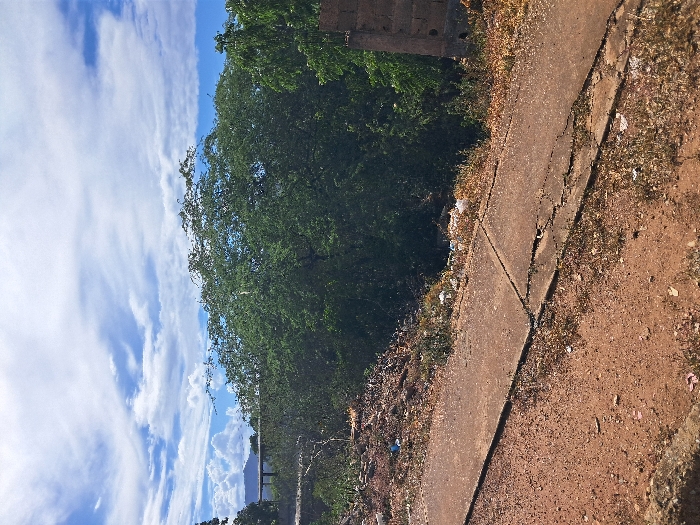A narrow, concrete path runs alongside overgrown vegetation, contrasting with red dirt on the other side