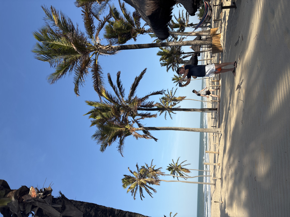 This image presents a bright, sunny beach scene located in Caucaia, Brazil. The foreground is composed of light-colored sand exhibiting ripples, with prominent, elongated dark shadows cast by numerous palm trees, indicative of direct sunlight. A light-skinned male, wearing a dark blue t-shirt, white shorts, and dark flip-flops, stands in the mid-ground, holding a black smartphone horizontally at eye level, positioned as if capturing a photograph or video of the beach and ocean to his left. An orange object is suspended from his left shorts pocket. Further into the mid-ground, closer to the water's edge and to the left of the first individual, a second light-skinned male, attired in a light grey t-shirt, dark shorts, and dark flip-flops, walks towards the left, looking down. The environment is dominated by a clear, uninterrupted blue sky. Many palm trees of varying heights are scattered across the sandy area, extending towards the ocean. The ocean is visible in the background, featuring a distinct waterline and small, breaking waves. Several wooden posts are vertically embedded in the sand between the individuals and the water. On the right side of the image, two thatched-roof structures are visible beneath a cluster of palm trees; a multicolored hammock is strung between posts near one of these structures.