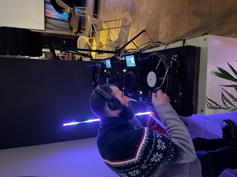 A DJ in a winter sweater and headphones is operating turntables. The equipment sits atop a white cabinet decorated with foliage, adjacent to a black panel illuminated by a purple neon strip. Speakers stand on the left. The scene is indoors with a tile floor.