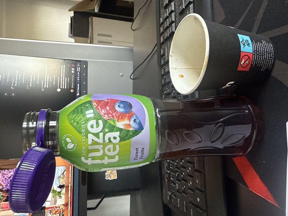 The image displays an indoor scene on a desk in Chomakovtsi, Bulgaria. Centrally positioned is an open, clear plastic bottle of "Fuze Tea Forest Fruits" containing a dark red liquid, with its purple flip-cap raised. To its right, a black paper cup stands, appearing largely empty with brown residue visible on its interior. A black computer keyboard is partially visible behind the bottle and cup, resting on a dark desk surface. A black mouse pad with a diagonal red stripe underlies the bottle and cup. In the background, a large computer monitor displays text in Cyrillic script, while a section to the far left of the monitor shows an outdoor image featuring people, purple flowers, and a coastal landscape. To the right of the monitor, a light-colored cabinet or set of drawers is partially visible.